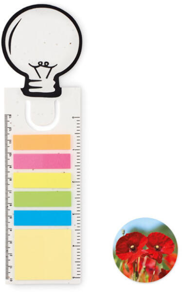 Magpapír könyvjelző villanykörte alakban, tartalmaz egy 13 cm-es vonalzós alapot, 1 sárga, újrahasznosított papírból készült öntapadós jegyzettömböt és 5 színű öntapadós jelölőket. Használat után a borítót földbe ültetve a benne lévő magokból pipacsok hajtanak ki.